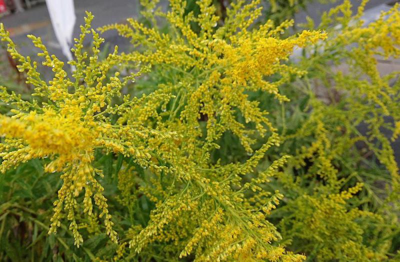 ●秋になるといたるところに繁茂する「セイタカアワダチソウ」がぐんぐん背丈を伸ばし大きなものは3メートルを超えるものもあり鮮やかな黄色の花を咲かせています 花は全体として円錐形をなし小さな花をたくさんつけて横枝は主軸に対して水平に近い方向に伸びているのよくわかります 明治時代末期に園芸目的で持ち込まれたものだそうですが今では荒れ地や休耕田などに繁茂しています