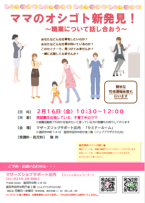 ☆マザーズジョブサポート庄内主催☆『ママのオシゴト新発見!』のお知らせです。 あなたはどんな仕事をしたいのかどんな仕事が向いているのかこのセミナーで、見つけてみませんか?一緒にお話してみませんか?簡単な適職診断も行います自分の適性をさぐってみましょう! ★★受講者の皆様へお願い★★場合によっては、体調の確認をさせていただくことがございます。状況によっては、ご案内の変更をさせていただきます。あらかじめご了承ください。★★ーーーーーーーーーーーー★★ 【日 時】2月16日(金)10時30分〜12時 【対 象】再就職を目指している子育て中のママ就職活動前で何かを始めたい方もぜひ!【会 場】マザーズジョブサポート庄内 セミナールーム【料 金】受講料 及び 託児料 無料【託 児】ご利用希望の方はお問合せください。保育ルーム開室日【水・木・金】の 10:00〜16:00に登録が必要となります。 ※併設の保育ルームで、保育スタッフが お子さんをお預かりします。 ママは安心して受講いただけます。 【駐車場について】お車でお越しの際は、中町庁舎脇にある〈セントラルホテル契約駐車場〉をご利用ください。(ジョブプラザさかたと表示してあります。)※契約駐車場が満車の場合は、酒田市中央地下駐車場をご利用ください。無料駐車券(最大2時間)を発行いたします。 どうぞ、お気軽にお問い合わせくださいね。 ◇お申込み・お問い合わせ◇マザーズジョブサポート庄内TEL:0234-28-8061メールでのお申込みはコチラ