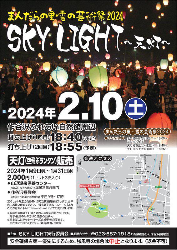 「まんだらの里・雪の芸術祭2024」を開催します。一面銀世界となる作谷沢で、天灯(空飛ぶランタン)の打上げを行います。ご友人やご家族、大切な人と一緒に願いを込めて天灯を打ち上げてみませんか!! 天灯は下記場所にて2,000円(1セット2枚入り)で販売します。200セット限定のため、なくなり次第販売終了となります。〇販売期間:2024年1月8日(月)〜1月31日(水)※作谷沢振興会は9日(火)〜〇販売場所 @山辺温泉保養センター 山辺町大字大塚801 販売時間:6:30〜21:00 A作谷沢振興会(作谷沢ふれあい自然館内)山辺町大字簗沢3102-1 販売時間:平日9:00〜17:00 ※駐車場は天灯購入者のみの優先利用となります。見学・撮影のみの方はご遠慮ください。お問い合わせ先/公益財団法人 作谷沢振興会 TEL:023-687-1918