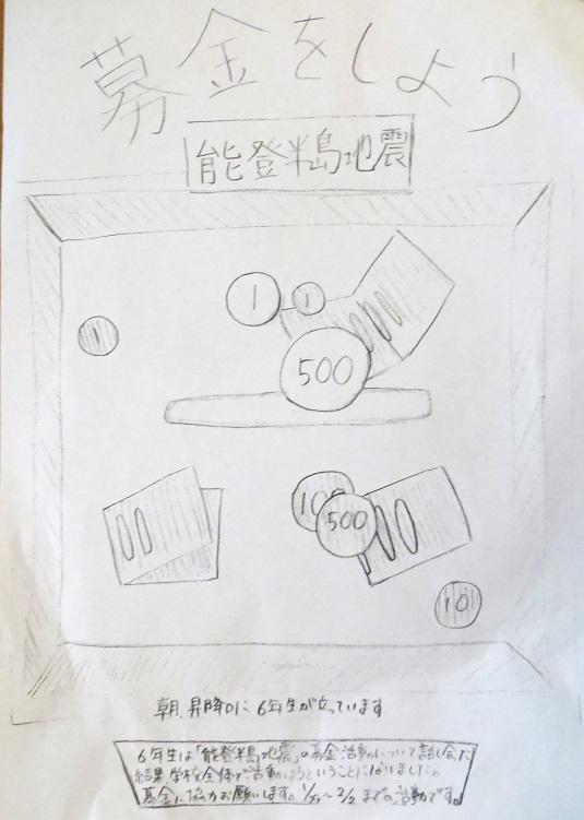 1月31日(水)、早いもので1月も今日で終わりです。能登半島地震が発生して1ヶ月が経とうとしています。現在も押しつぶされた家屋や垂れ下がった電線等、地震直後と変わらない景色がテレビ画面に映し出される度に心が痛みます。このような現状を目の当たりにする中、子供たちから「遠く離れた私たちにも何かできることはないか…」という声が挙がり、今週月曜日から6年生を中心にした募金活動が始まりました。自分たちで考え、話し合い、行動にうつす姿は、まさに本校で目指している姿そのものです。辛い思いをされている被災者の方々に対する温かな支援の輪が、本校でも広がりつつあります。