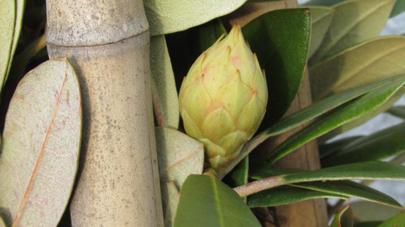 ●固い皮の包まれたシャクナゲの芽ですが その中に数個の花のつぼみが包まれています 2センチほどの大きさで5月頃にならないと花が咲きませんのでまだまだ遠い先のことですが楽しみに待ちたいものです