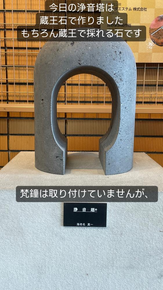 親子三人展の三日目をご覧になっていただいた皆様、誠にありがとうございます。本日の『浄音塔』は蔵王石で製作したものです。これまで浄音塔は最上石だけを使い製作してきましたが三人展で展示するために他の石種も試作してみようと思い、蔵王石を使ってみました。まだまだ、表面の仕上げにも工夫ができるのではないかといろいろ考え中です!!