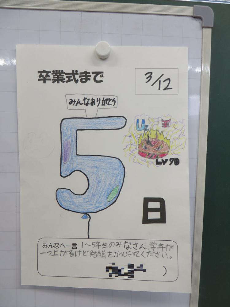 3月12日(火)、昨日は17日の振替休業日としていたため、子供たちは3連休明けの登校となりました。6年生のカウントダウンカレンダーを覗いてみると今日でラスト5日。本当にあっという間です・・・。 お昼のロング昼休みの様子です。子供たちにとっては、週2回(火・木)のゆったりできる楽しみな時間です。今年度は今日を含め、あと2回で終了となります。外はあいにくの雨のため、屋内でそれぞれの時間を過ごしていたようでした。高学年はこの時間を活用して奉仕活動をする姿も度々見られます(いつもありがとう!)。6年生は中学校に進学すると、学校では思いっきり遊んだりゆったり休んだりする時間も少なくなることでしょう。明後日のロング昼休み(今年度ラスト)、幸せな時間をぜひ満喫してくださいね! 話は変わり・・・ 本日、業間の時間を活用して、「いのちについて考える集会」を行いました。例年、東日本大震災が起きた3.11前後に当時の出来事や教訓を忘れないように、そして、命の尊さについてじっくり考えるために実施しているものです。今回は、東日本大震災だけでなく、今年1月に起きた能登半島地震の様子も加えながら話をしたところです。みんな真剣な表情で聞いてくれました。今ある幸せな時間に感謝し、自分の命はもちろん、他者の命も大切にできる子供たちに育ってほしいと願っています。