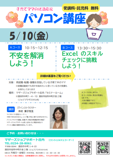 ☆マザーズジョブサポート庄内主催☆毎回大人気!『パソコン講座』のお知らせ ≪Aコース≫ 5月10日(金)10:15〜12:15『不安を解消しよう!』「求人票の"パソコンが使える方"ってどの程度?」「仕事では、どのくらいのスキルが求められるの?」「WordとExcelって、どの程度使えると大丈夫?」こんな不安を解消しつつ、効率的な文字入力や便利なショートカットなど、仕事でぐっと差がつくパソコンの基本操作について学び、今後のスキルアップに役立つ情報を提供します。 ≪Bコース≫ 5月10日(金)13:30〜15:30『Excelのスキルチェックに挑戦しよう!』Excel、使いこなせていますか?実務で使える内容をギュッとまとめてご紹介します♪基本操作のスキルチェックで自分が理解しているところとそうでないところが明確に?講師の「なるほど〜」な解説を聞き理解をぐっと深めます。♪片方のコースのみ、両方のコース、どちらの受講でも可能です♪【対 象】再就職・転職・復職を目指している子育て中のママ※就職活動前で何かを始めたいママもOK【会 場】マザーズジョブサポート庄内 セミナールーム【料 金】受講料 及び 託児料 無料【託 児】※事前登録・予約が必要です。 保育ルーム開室日【水・木・金】の 10:00〜16:00に登録にお越し下さい。 ※併設の保育ルームで、保育スタッフが お子さんをお預かりします。 ママは安心して受講いただけます。 【駐車場について】お車でお越しの際は、中町庁舎脇にあるセントラルホテル契約駐車場をご利用ください。(ジョブプラザさかたと表示してあります。)※契約駐車場が満車の場合は、酒田市中央地下駐車場をご利用ください。無料駐車券(最大2時間)を発行いたします。お帰りの際に、コンシェルジュ窓口へお声がけください。どうぞ、お気軽にお問い合わせくださいね。◇お申込み・お問い合わせ◇マザーズジョブサポート庄内TEL:0234-28-8061メールでのお申込みはコチラ