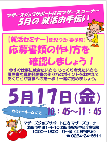 5月 マザーズジョブサポート庄内 マザーズハローワークコーナー ☆☆☆☆☆☆☆☆☆☆☆☆☆☆☆☆☆☆☆☆求職支援セミナー 『応募書類の作り方 確認しましょう!』 を行います! このセミナーは就職への第一歩! 履歴書・職務経歴書のポイント をお伝えします。☆☆☆☆☆☆☆☆☆☆☆☆☆☆☆☆☆☆☆☆ ______________________模擬面接 ご希望に合わせ随時お受けいたします。 面接が久しぶりな方や苦手意識がある方に 特におすすめ、よくある質問をもとに練習し 具体的なアドバイスを致します。______________________ ハローワークマザーズコーナーでは 定期的にセミナーを開催します。 奮ってご参加下さい。 受講後も疑問点など、 窓口にてご相談が受けられます。 【日 時】 5月17日(金) 10時45分〜11時45分【対 象】 お仕事探し中の子育てママさん【会 場】 マザーズジョブサポート庄内 セミナールーム【料 金】 受講料 及び 託児料 無料 ※お申込みが必要です。【託 児】 ※事前登録・予約が必要です。 ※併設の保育ルームで、保育スタッフが お子さんをお預かりします。 ママは安心して受講いただけます。 【駐車場について】 お車でお越しの際は、中町庁舎脇にある セントラルホテル契約駐車場をご利用ください。(ジョブプラザさかたと表示してあります。) ※契約駐車場が満車の場合は、 酒田市中央地下駐車場をご利用ください。 ご利用の方は、無料駐車券を(最大2時間) を発行いたします。 お帰りの際に、マザーズコーナー窓口へお声がけください。 どうぞ、お気軽にお問い合わせくださいね。 ◇お申込み・お問い合わせ◇ マザーズジョブサポート庄内 TEL:0234-24-6611(ハローワークマザーズコーナー) TEL:0234-28-8061(コンシェルジュコーナー)