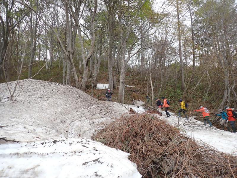5.01博物園オープンセレモンーに参加しました。今年の関心事はなんといっても降雪量の少なさです。軽く見て3mはマイナスでしょう。ブナ純林のエリアだけに要注意です。 目の前のトレールは残雪無しです。開講以来初です。