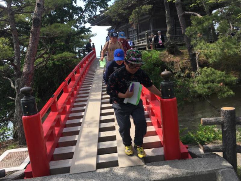 10時です。五大堂と瑞巌寺の見学が終わりました。子供たちは、ガイドさんの話を黙って聞き、メモもしっかりとっていました。とてもよい姿が見られます。次は遊覧船です。
