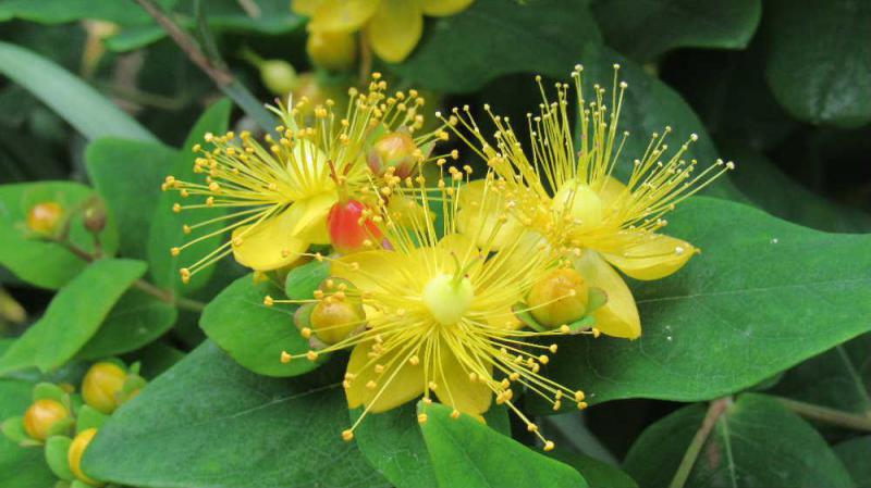 ●鮮やかな黄色の花びらと可愛らしい雄しべがたくさん角のように伸びた「キンシバイ」が今を盛りと咲いています「キンシバイ」ととても似]いる「ビヨウヤナギ」がありますが花の付き方や花の様子が違うようです 花が終わると真っ赤な実をつけますので黄色の花と真っ赤な実のコントラストが鮮やかです とても育てやすくほったらかしておいても毎年花をつけてくれる花木の一つです