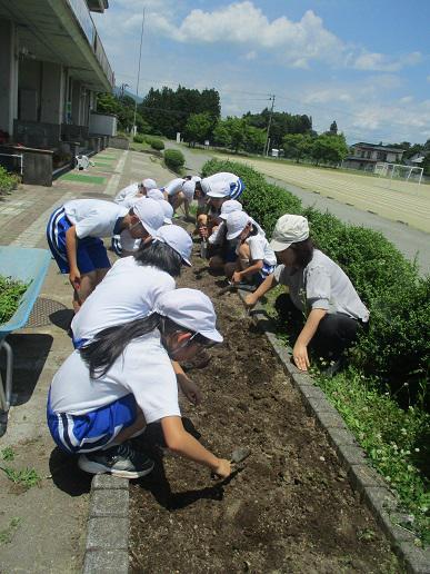3年生から4年生まで、花壇やプランターに「花」を植える日。4年生は、4時間目に草むしりから始めました。 3年生は、プランターに。「水いる!」とじょうろを取りに来たRさん。誰も気づかないのにすごいぞ! お、できたね。 こちらはサルビア! たっぷり水をあげましょう。お花も喜んでいるよ。 午後は、人権擁護委員の方々が来校し、一緒に花植えをしてくださいました。 まずはみんなで草むしり。 草回収ありがとう! だんだん花壇が出来上がります。 仕上げはやっぱり、たっぷりの水。花も気持ちよさそうだね! 今朝、ちょっとベニバナが気になって畑へ…。順調順調! おっ、6年生。 ありがとう。 Cさんは、他の当番がスクールバスで、まだ登校していないので、3年生の花すべてに水をかけました。ありがとう。 4年生もやってきましたよ。 植物を植えるのも、大切な「いのちの学習」。実は、昨年は暑くて暑くて、朝することもたくさんあるし、多くの花が枯れてしまいました。こぐわっ子たちは、今年どんな工夫をするのでしょう。 秋まで花の「いのち」が絶えませんように・・・!
