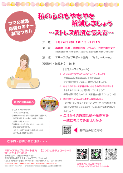 ☆マザーズジョブサポート庄内主催☆『私の心のもやもやを解消しましょう〜ストレス解消と伝え方のセミナー〜』のお知らせです。就職を目指しているあなた!家庭と仕事の両立に悩んでいるあなた!日頃のもやもや(不安や悩み)の解消するには…考えてみませんか? ストレス解消法やコミュニケーションの仕方を見直してみませんか?ストレスとうまく付き合いながら就職活動、働き方を一緒に考えてみましょう♪ 【日 時】9月26日(木)10時15分〜12時15分 【対 象】再就職・転職・復職を目指している子育て中のママ※就職活動前で何かを始めたい方でもOK【会 場】マザーズジョブサポート庄内 セミナールーム【料 金】受講料 及び 託児料 無料【託 児】※事前登録・予約が必要です。ご利用希望の方はお問合せください。保育ルーム開室日【水・木・金】の10:00〜16:00に登録が必要となります。 ※併設の保育ルームで、保育スタッフが お子さんをお預かりします。 ママは安心して受講いただけます。 【駐車場について】お車でお越しの際は、中町庁舎脇にある〈セントラルホテル契約駐車場〉をご利用ください。(ジョブプラザさかたと表示してあります。)※契約駐車場が満車の場合は、酒田市中央地下駐車場をご利用ください。無料駐車券(最大2時間)を発行いたします。 どうぞ、お気軽にお問い合わせくださいね。 ◇お申込み・お問い合わせ◇マザーズジョブサポート庄内TEL:0234-28-8061メールでのお申込みはコチラ