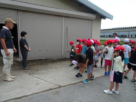7月4日、生活科の勉強で、2年生が牛小屋見学に行ってきました。2年生の生活科では、場所やそこで働く人々について見たり聞いたりし、自分たちとのかかわりについて考えていく学習があります。今回は、学校近くで牛の飼育を行っている酪農家を訪ね、インタビューや見学をさせていただいたり、えさやりを体験させてもらったりと、有意義な時間になりました。子ども達は、農家の方の努力や工夫を知り、自分たちのために一生懸命に働いている方々がいるんだなあと、自分事として考えることができました。酪農家の皆さん、お忙しい中、ありがとうございました。