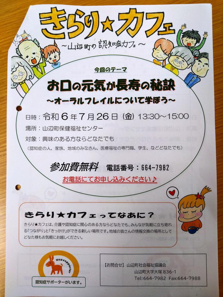 お口の元気が長寿の秘訣〜オーラルフレイルについて学ぼう〜オーラルフレイルをご存じですか?オーラルフレイルは口の機能の健常な状態と低下との間にある状態で,将来のフレイルや要介護認定,死亡のリスクが高いことがわかっています。この度講師をお招きして、詳しくお聞きしたいと思います。ぜひご参加ください。日時:令和6年7月26日(金)13:30〜15:00場所:山辺町保健福祉センター対象:興味のある方ならどなたでも 参加費無料申し込みはお電話で023-664-7982きらり★カフェとは?きらり★カフェは、介護や認知症に関心のある方ならどなたでも、みんなが気軽に立ち寄れる「つながり」と「きっかけ」ができる新しい場所です。地域の皆さんの情報交換の場所としてどなたでもお気軽にお越しください♪