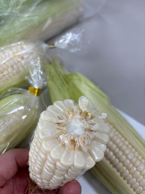白いとうもろこし『雪の妖精』を頂戴しました。「生でも食べられるよ!」と教えていただいて、初生食。…甘い!あっま〜い!糖度が高いです。その後、袋のままレンチン4分間。(レンジ対応の袋だそうです。さらに、袋の上からでも包丁で切れる。優れもの!)頭の方までしっかり甘いです。(生の時の方が甘さは強く感じます。)初めての『雪の妖精』美味しかったです。ご馳走様でした〜。