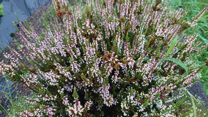 ●クッションのようにこんもりと茂り小さな白やピンクの花をびっしりつけている「カルーナ」という花が咲いていました 枝全体が花穂のように見えます 学名の「Calluna」は「掃く」という意味がありこの枝でほうきを作ったことに由来しているのだそうです 何かの花に似ていますが思い出せません