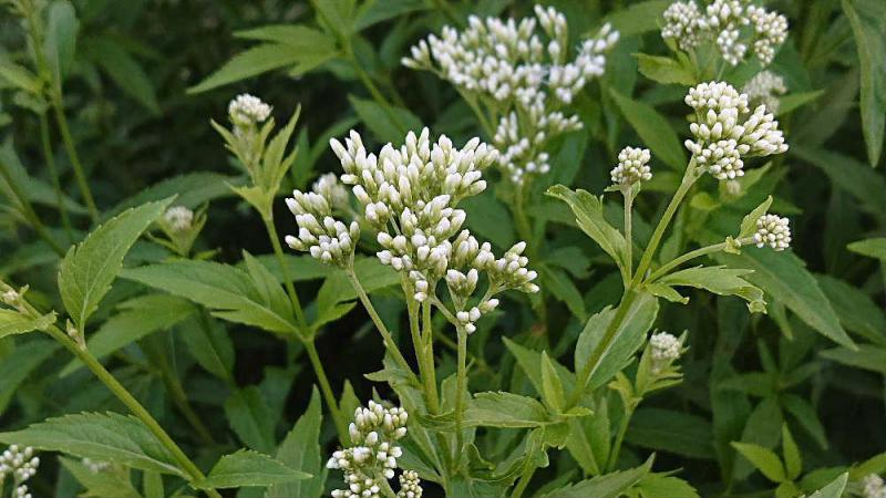 ●散歩中の道路沿いの花壇で茎の先に白い小さな花を房状につけた草花をみつけました「フジバカマ」(?)でしょうか 川沿いの湿った草原などに生えていて秋の七草の一つで万葉の時代から人々に親しまれてきた植物だそうです 生乾きの茎や葉には桜餅の香りがあるとか また目にとまったら香りを嗅いでみようと思います