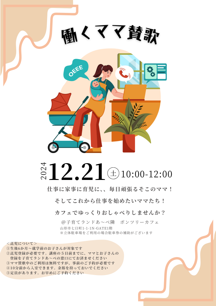 12月のコンシェルジュセミナーのお知らせです!「働くママ賛歌」仕事に育児に家事に、毎日頑張るママたち!そしてこれから仕事を始めたいママたち!本当に毎日お疲れさまです!みんなでお互いをたたえ合い、リラックスしながらおしゃべりできるセミナーを開催します!頑張っているみんなの話をシェアして、励まし合い、笑い合えるひと時を一緒に過ごしましょう!託児もご利用できますので(要予約)、どうぞお気軽にお申込みくださいね。皆さんのご参加を楽しみにしています! ☆-----------------------------☆【日時】12月21日(土)10:00〜12:00【会場】子育てランドあ〜べ隣 ポンツリーカフェ【託児有】定員があります、ご相談ください【参加費・託児費】無料 お問い合わせ・お申し込みはマザーズジョブサポート山形コンシェルジュコーナーTEL:023-665-5915メールでのお申し込みはコチラ