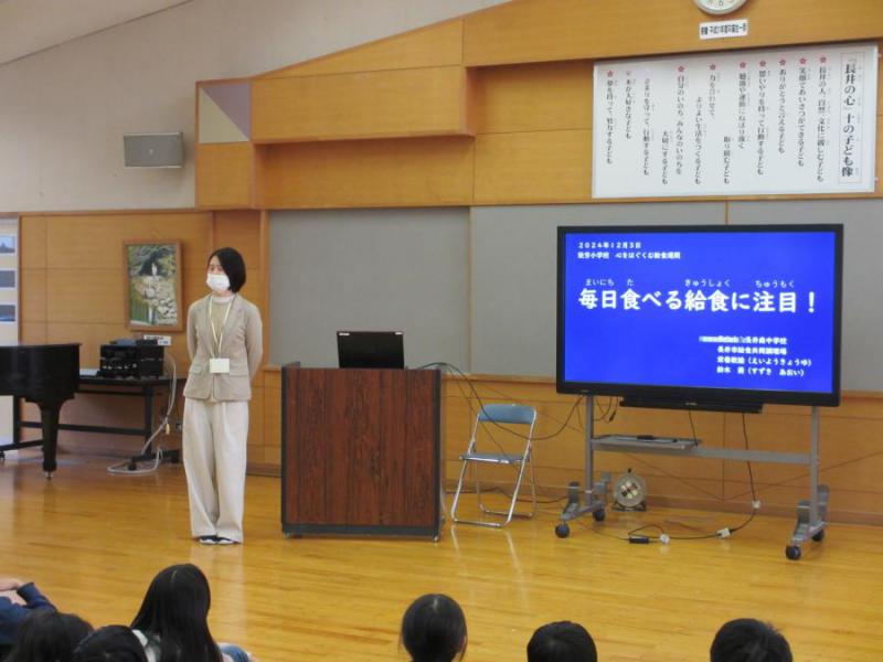 今週は、『心を育む学校給食週間』です。その皮切りに、栄養教諭をお招きして食育講話をしていただきました。給食がどのようにして作られているのかを分かりやすい動画で紹介していただきました。また、クイズなども途中に入れていただき、楽しく学ぶことができました。食事のマナーも教えていただきましたが、大事なことですよね。将来につながる力です。最後は、給食委員会の委員長さんからのお礼の言葉です。給食を作ってくださっている方々に感謝しながら、マナーを守ってしっかりいただきたいと思います。で、ほんとは講話の前に表彰を行ったのですが、その皆さんです。「防犯ポスターコンクール」と「けん玉ペインティングコンクール」の受賞者です。おめでとうございました。