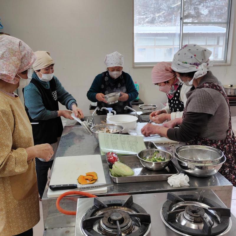 本日、中川公民館を会場に中川地区食生活改善推進員会による、「伝達講習会」が実施されました。栄養に関する講話のあとは、調理実習です。カボチャの肉巻きマスタード、タマネギとキュウリのマリネ、しめじとゴボウの煮物、ツナごはんにフルーツヨーグルト。食改さんの指導のもととはいえ、講習会に参加のみなさんもベテラン主婦揃い。手慣れた様子で調理を終えて試食です。お一人欠席とのことで、私もお相伴にあずかりました(≧∇≦)bどれも減塩メニューとは思えない満足感で、とっても美味しかったです!ご参加の皆様も美味しかった!完食した!と大満足のご様子でした。ご参加の皆様、食改の皆様お疲れ様でした(*'▽'*)