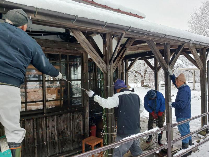 12月15日、昨夜から降った雪は、本格的な冬の到来を感じさせるものとなりました。そんな中、会員による雪囲いと電飾の設置作業を行いました。 会員の一人が「去年どうしたか覚えていられないから、今年は写真を撮っておく。」と言う。すると別の一人が「写真を撮ったことを覚えていなかったりして。」と突っ込む。一同大笑い、寒い中でもホッカリ。 点灯は今日の午後4時から、来年の1月11日まで。この後駅茶では、あったか鍋を食べながら忘年会を行います。なお駅茶は、冬の間はお休みとさせていただきますので、ご了承下さい。