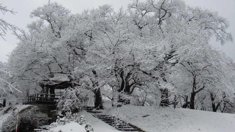 ●真っ白な花が満開に咲いたような今朝の1枚です 今朝の雪は湿り気の多い重たい雪で烏帽子山公園の桜の枝にも花が咲いたように雪が付いて真っ白な水墨画のようです 誰もいない静かな公園ですが桜が一面に咲いたような風景で春の桜の季節のざわめきが聞こえてきそうです 気温が上がるとまもなく花びらがひらひらと散るようにではなくボタボタと枝から落ちるのでしょうか