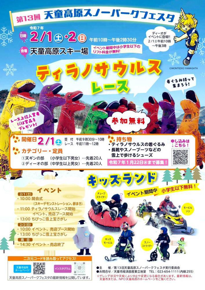 天童高原スキー場で開催されるイベントです。雪中に隠された当たり券を探し出し、様々な景品がもらえる「ちびっこ雪上宝探し大会」など、子どもが楽しめる企画が盛りだくさんです。2日間、小学生以下はリフトが無料で、人気のモービルソリ、チューブスライダーも乗り放題です。【日程】2/1(土)〜3/20(木・祝)【場所】天童高原スキー場特設会場【問い合わせ】天童高原スノーパークフェスタ実行委員会 (天童市経済部産業立地室内) 電話 023-654-1111【イベント詳細】天童市ホームページ