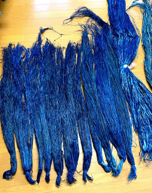 いよいよ取り付けの準備に入り、染められた青苧の繊維を自然乾燥させるとゴワゴワの繊維の