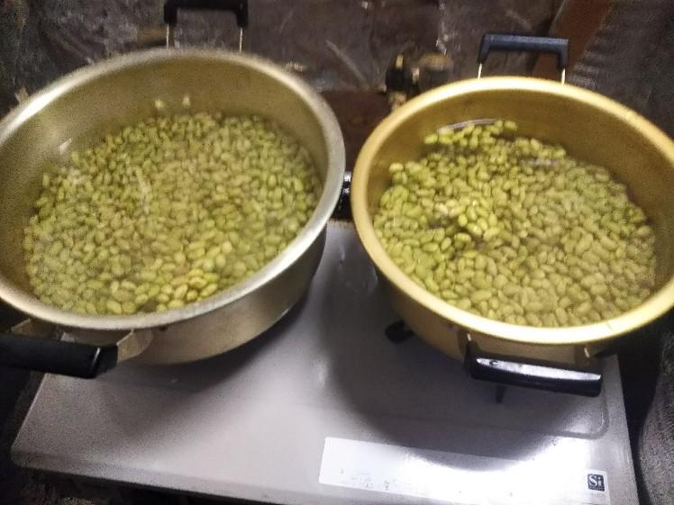 明日、従妹とその友人と我が家の3家族分の手作り味噌仕込みをします・・いわゆる寒仕込みというやつです、この寒仕込みとは、前年の秋に収穫した新穀大豆と米を原料とし、1月の寒の内(小寒の1月5日から節分2月2日までの約30日間)に行う伝統的な味噌づくりの手法を用いた味噌の仕込みをいいますね。 寒さが厳しいこの時期、空気中の雑菌が少なく仕込みに最も適しているといわれています。昔からの知恵ですよね、現在のように雑菌が問題ない施設があればいつでも仕込めますが・・昔は酒、しょうゆ、みそとかこの時期に仕込むわけです・・ということで我が家の家庭菜園で採れた大豆で前に試してみて好評だった、その味噌がなくなり、市販味噌食べたらとてもまずく感じて、また作ろうとなったわけですが、昨年菜園で採った大豆(秘伝)ですが、ちょうど収穫した前が雨で、ぬれたままかごに入れて・・そこからなんやかんやと畑片付けやら、昨年は追悼コンサートの練習準備で忙しくてかごを放っておいたら、さやはカビだらけ・・もったいないけど豆は処分した、肥塚に捨てたから芽出したりして??。今回は自家製豆がなくなったために、友人の自給自足人から1k700円で分けてもらった大豆を用います・・・初めからこうしたほうが手間がかからん・・自家製の満足感が少し減るけども次回からも友人から買うことにしますね・・豆は枝豆で食べる分だけ作ることにしましょ・・なんて思いながら・・出かける前に、今朝は早朝から煮てます・・煮終わったらスキーしに天元台へと出かけます、そしてアルブ手伝いバイトして翌朝帰宅10時から集まり、茹でた豆のすりつぶしと麹と塩混ぜてしてこねこね容器に入れて仕込みます、戻し時間は5〜10時間ほどです