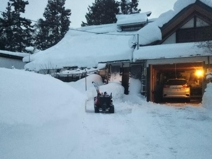 5日(水)から8日(土)にかけて、米沢市のラインで警報級の大雪注意が来た、今日6日(木)も日本付近は強い冬型の気圧配置で、強い寒気が流れ込んでいる、昨日除雪して出かけ、帰宅時は何とかそのまま車庫入りしたが、今朝、見るとひざ下までの積雪、昨日に続きお出かけ前の除雪でした、日本海側を中心に深夜から雪が降っている。 早朝6時から7時まで除雪かかりました、市道までの序口だけで時間なく終了、今日は家の北側屋根まで接近した雪の片づけが必要ですね・・トホホです、今現在は小康状態の雪ですが、このあとも北海道の日本海側から北陸は雪が強く、さらに積雪が増えるでしょうとの予報、風も強く、暴風雪となる所もあるという、一昨日、昨日、今日と市内小学生のスキー授業担当、子供は風の子だけと爺は寒さに弱いです・・雪で大変でございます