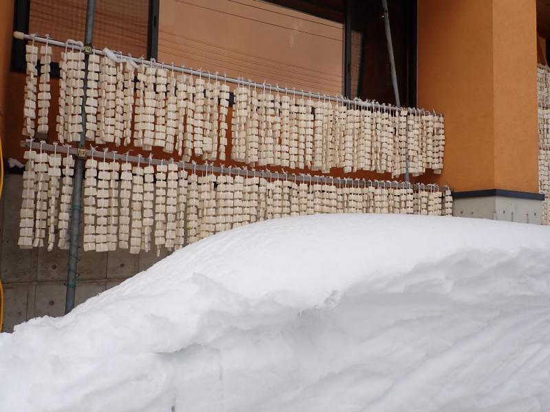お餅を切って寒ざらしをするのです。凍みて乾かして、凍みて乾かして〜製品はそりソリして美味しい。