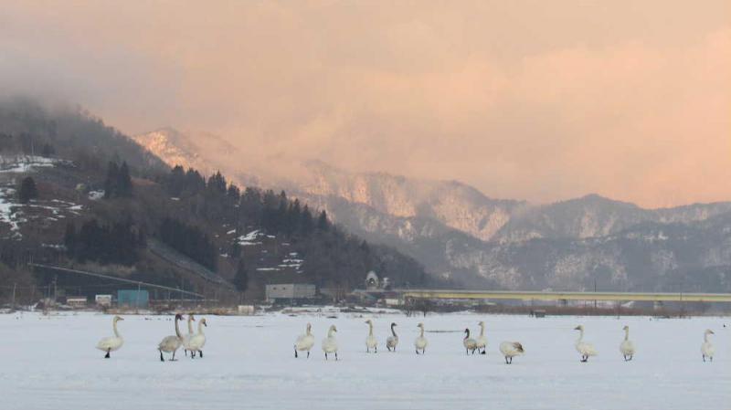 ●春を探しに出かけた散歩で雪の消えた田んぼに白鳥 ようやく青い空や白い雲と残雪の回りの山並みと春の兆しを感じることができるようになりました 東の山は夕日に赤く染まり雪の消えた田んぼで白鳥が餌をついばんでいました まだ北には帰っていませんでした もう少し名残の雪を楽しみたいのでしょうか