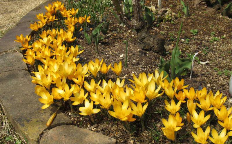 ●暖かな日が続いています 花壇の縁の黄色のクロッカスが一斉にさきました 陽の光をあびて気持ちよさそうに咲いています これから白や紫の花がさきます 春の花は黄色がおおいのですがクロッカスはどうして黄色の花が一番最初に咲くのでしょうか