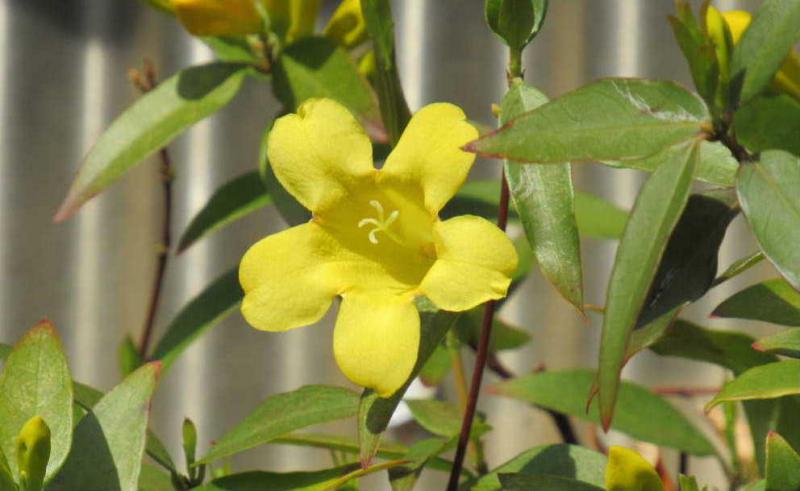 ●黄色のカロライナジャスミン 今日は祝日「みどりの日」で新緑が眩しい季節です 20数年前に植えたつる性のカロライナジャスミンが今年も黄色の可愛い花を咲かせました これから次々と黄色の花を咲かせジャスミンの香りを漂わせてくれる花です きれいな花ですが花も葉も有毒であることを知りました 色も香りもステキですが怖い花です 花が終わるとつるを伸ばしその始末に四苦八苦します