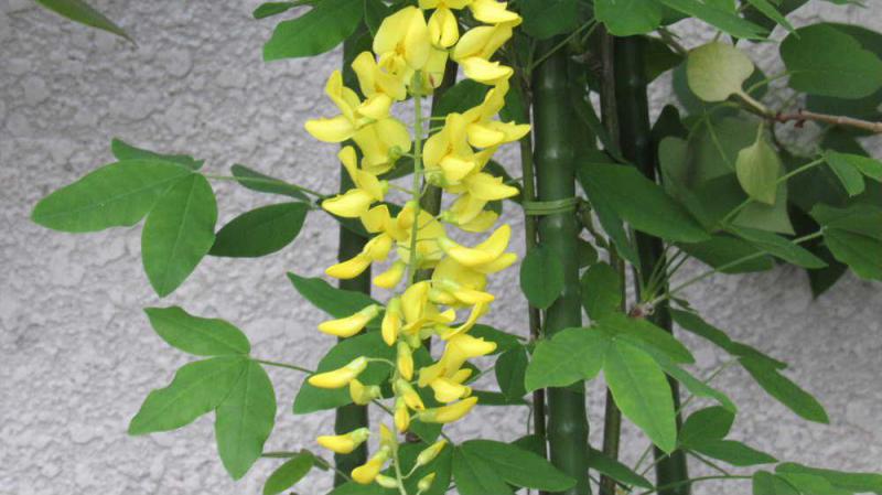 ●黄色のフジの花 挿し木で育てた「キングサリ」が黄色の花を5つ咲かせています 黄色のフジのような花で「黄花藤」とも呼ばれる花木でつる性ではありません 藤のような長い花ではありませんが鮮やかな黄色はたくさん咲いたら見事だろうと成長するのを楽しみにしています 美しいのですが有毒植物で特にタネは毒性が強いので要注意とか