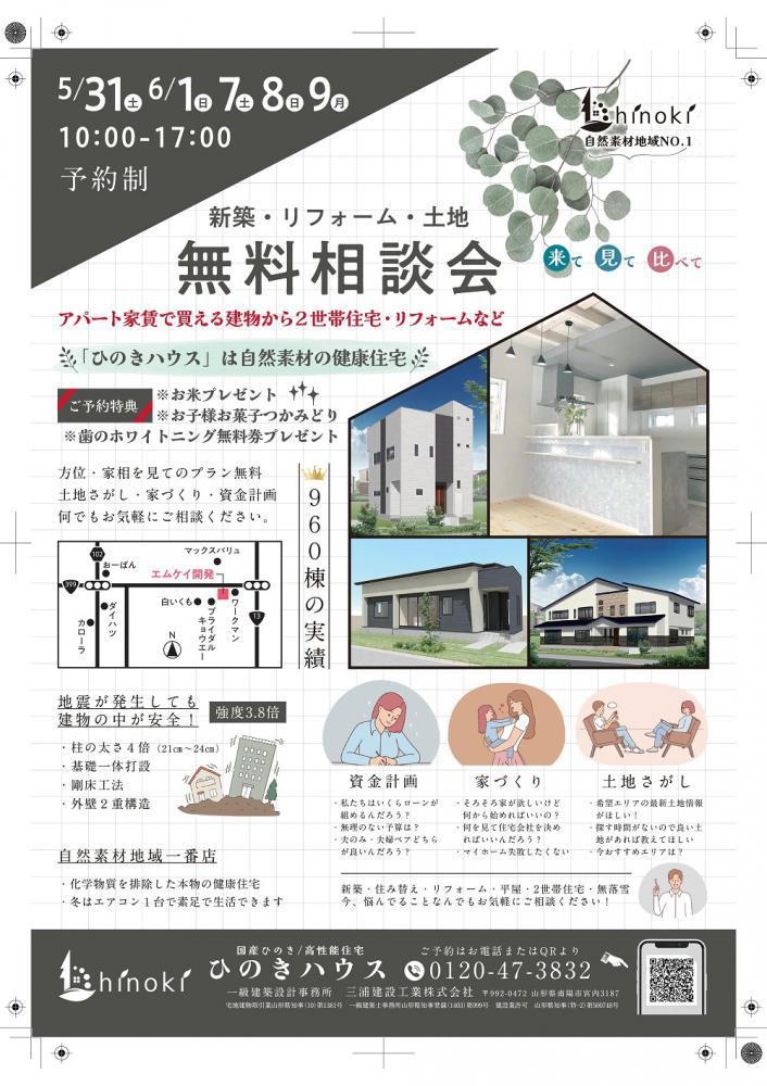 新緑の候、皆様におかれましては、益々ご清祥の事とお喜び申し上げます。さて、この度、南陽市赤湯におきまして『無料なんでも相談会』を開催いたします。土地・建物・リフォームの事なんでも弊社の無料相談会をご利用くださいませ。 ●日  時:5/31(土)、6/1(日)、7(土)、8(日)、9(月)       10:00〜17:00(予約制)  ●会  場:南陽市赤湯2856−1  ●来場者得点:@お米プレゼント        Aお子様お菓子のつかみ取り        B歯のホワイトニング無料券プレゼント  ●ご連絡先 :0120−47−3832   ※完全予約制となりますので、予めご連絡お願いいたします。      三浦建設工業スタッフ一同、皆様のお越しを心よりお待ちしております。