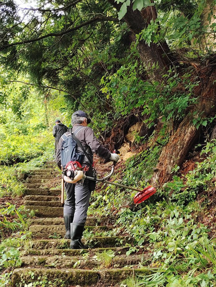 本日6/1(日)、岩部山三十三観音保存会、各地区役員の皆様で岩部山の遊歩道整備を行いました。小雨の降るなか、早朝から草刈り、階段設置お疲れ様でした。