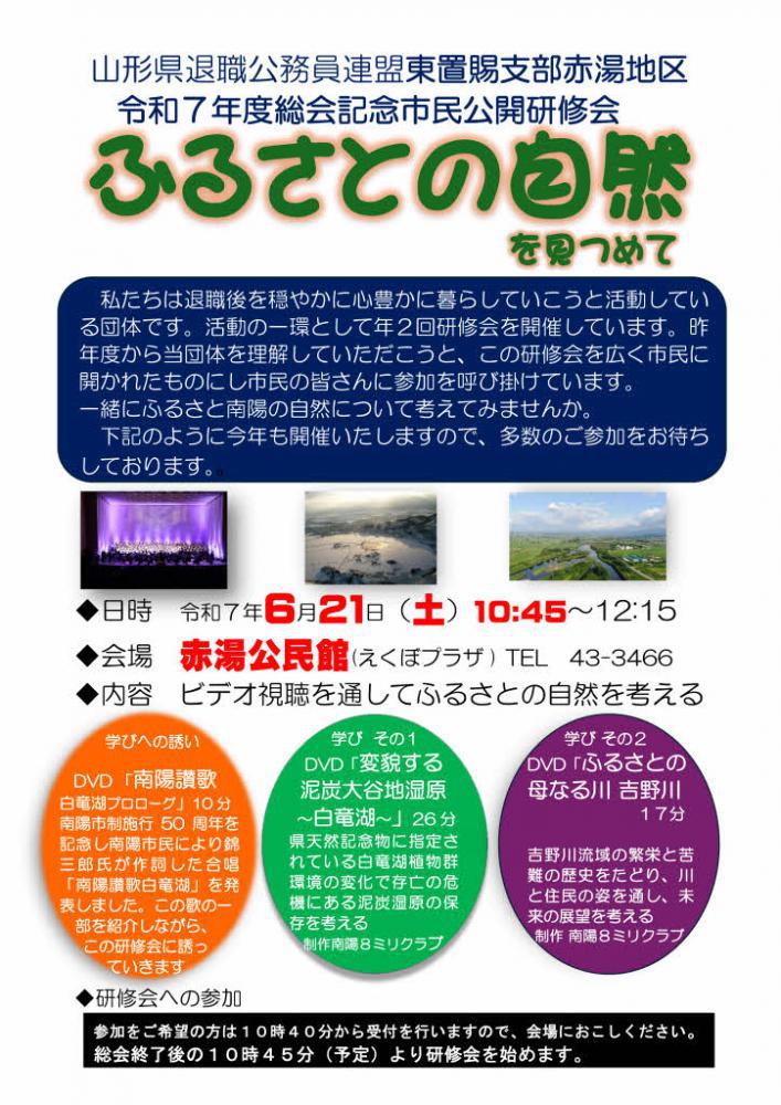 ●「ふるさとの自然をみつつめて」 このようなテーマで研修会を企画しています 教職員OB会の退職公務員連盟の会員の研修会を広く市民にも参加してもらおうと参加者を募っています 参加費は無料でどなたでも参加できるよう土曜日の午前に開催いたします ご興味のあるかたはぜひご参加を