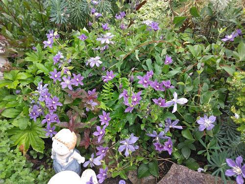 昨日UP出来なかった、一昨日6/10の残りの写真〜!クレマチス達です。 (トップ写真)は、 ロックガーデンの真ん中に陣どっている『アラベラ』半ツル性の這うタイプのクレマチスです。長い期間咲き続けてくれる我庭の優等生〜♪ロックガーデンになじんでいます。  ↓『プリンス・チャールズ』たくさんの花を垂れて咲いてくれるので下からでもきれいに撮れました。こちらも長く咲いてくれる優等生〜♪   ↓『プリンセス・ダイアナ』   ↓『雪小町』  『水面の妖精』絵に描いたような花ですね。  『大河』