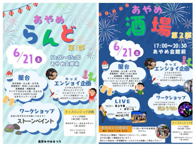 【第1部】あやめらんど(11:00〜15:00)地元グルメが味わえる「あやめ屋台」や、お子さま向けのアクティビティを多数ご用意しています。 主な内容: ◇ふうせんたけさんのバルーンアート◇尹さんによるジャグリングパフォーマンス ◇けん玉パフォーマンス◇ジャンボ射的◇めだかすくい・おもちゃすくい《ストーンペイントワークショップ》 【第2部】あやめ酒場(17:00〜20:30)夕方からは、屋台グルメとともに夜まつりの雰囲気をお楽しみいただけます。 主な内容:◇マジシャンTAISHIによるステージ◇ふうせんたけさんのバルーンアート(再登場☆)◇ジャンボ射的・すくい系ゲーム(引き続き開催!) 《ピカピカ光るうちわづくりワークショップ》◆音楽ライブ(LIVEステージ)18:00〜 井上千春+ボヌール19:00〜 mojo◆「長井おどり」練習会(17:30〜、会場内・雨天中止)【同時開催】お買い物スタンプラリー会場内でスタンプを集めて応募すると、豪華景品が当たるチャンスも!イベント詳細は、チラシをご覧ください。皆さまのご来場を心よりお待ちしております(*'ω'*) *・゜゚・*:.。..。.:*・*:゚・*:.。. .。.:*・゜゚・**・゜゚・*:.。..。.:*・*:゚・*:.。. .。.:*:.。. .。.:**:.。. .。.:*:.。. .。.:* 【長井市観光協会 公式アカウント】長井市観光協会ではFacebook・Instagramのアカウントを作成しております。あやめの開花状況、あやめまつりのイベントの情報など発信しております!是非お目通しくださいませ(*^ω^*)!!FacebookInstagram