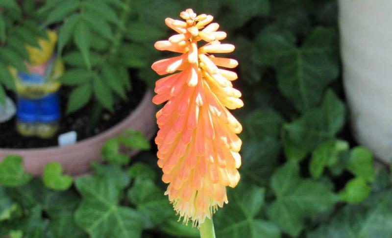 ●長い茎の先にオレンジ色のまるでたいまつのような「トリトマ」が咲いています 今日から7月暑い夏を象徴するかのように鉢植えの「トリトマ」が花を付けてくれました 赤・オレンジ・黄色がグラデーションになって咲く様子はあまり目にすることのない花で庭の花壇のアクセントになる花です「トーチリリー」とも呼ばれほったらかしておいても育つので花壇でも鉢植えでも育てやすい花です ですが我が家の「トリトマ」は痩せて花も小さめです