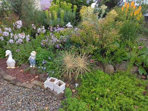 きのうは、朝から雨が降り出して恵みの雨でした。窓を開けるとちょっと冷たい風が・・・朝までフルのエアコンも止めて、昼近くまで過ごすことが出来ました。晴れ間を見ながら、宿根草をカットしたり倒れたのを補助したりで少し庭仕事もできました。 ブログも前2回、長編になってしまい頑張りすぎて我が庭のブログ再開、頭が回りません…写真がたくさん溜まってしまいました。昨日は、雨で6月を思わせてくれる写真だったので涼しげな庭を。  (トップ写真)は。いつものじーじのロックガーデン〜代り映えしませんが、ユーフォルビアも早く剪定しないと暑くなり時期を逃してしまうのですが、バラの剪定も沢山あり、中々進みません。クレマチスのアラベラは今日終わりました! ↓”クニフォフィア”も長く咲いてくれている  優秀な子です。後ろの方では、紫陽花がまだ頑張ってくれています!  ↓東側のアジサイのエリア…遅咲きだったのでまだまだ大丈夫…  まだ、頑張って咲いているクレマチス…  いろんな花が混載している中、ピンクの"モナルダ"も咲き始めました。 今年の庭は、みんな競って咲いています〜!  最後に・・・昔の庭を感じる、ちょっとほっとする池の風景・・・水の流れがいいですね。