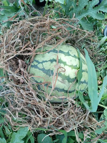 我が家のスイカが、ようやく大きくなってきた・・今年は雨が少なく、成長が悪かった・・水やりするわけでなく、周りの雑草とりも行き届かなく、6本植えた苗は2本は干からびてしまいましたがね・・ほんとちゃんと手入れしないと、それなりにしかなりません・・カラスに獣にやられないようにしないと・・