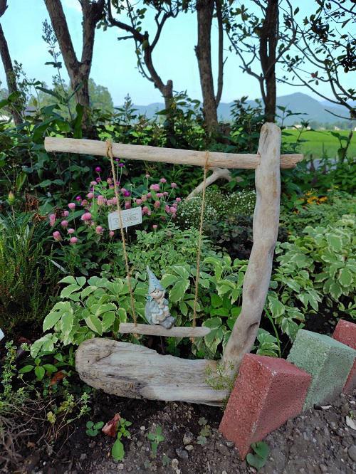 昨日から急に気温が下がり、朝は冷たい風・・・!期待している雨は、降ってくれません。明日は、また30度越えの予報ですが、寒暖差で体がつらいです。じーじは、へっちゃら?朝から半袖のTシャツ一枚で庭仕事していました… 先日紹介した花友Kちゃんから写真届きました〜♪今回は、旦那様の作品『流木のブランコ』先日、海から拾ってきた流木で作ったブランコ。Kちゃんが希望するものは、あっという間に完成!素晴らしいですね。我が家のじーじとは、ちょっと違う器用さミニチュアが得意で、ミニハウスなどたくさんお家に飾られています。 お庭の写真もコラージュで頂きました(^_^) 花ネタも少なくなってきた我が家のブログですがKちゃんのお庭はお助けマンです(^^)
