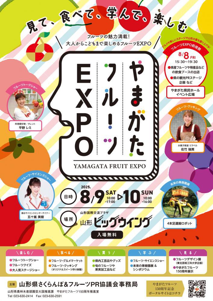 【やまがたフルーツEXPO 2025】平野レミさんも登場!日程・内容・FAQを徹底ガイド2025年8月9日(土)・10日(日)、山形ビッグウイングでフルーツの祭典「やまがたフルーツEXPO」が開催!平野レミさんのトークショーをはじめ、親子で楽しめるイベントが満載です。この記事で詳細をチェックしよう!やまがたフルーツEXPO 2025見て、食べて、学んで、楽しむフルーツの祭典! 開催概要 日時2025年8月9日(土) 10:00〜17:002025年8月10日(日) 10:00〜16:00 場所山形国際交流プラザ 山形ビッグウイング 料金入場無料 プログラム紹介楽しむフルーツトークショーフルーツクイズ大人気ステージショー食べるフルーツ・グルメマーケットオリジナルスイーツ作り体験買う県内工芸品やグッズ旬のフルーツや果実加工品学ぶフルーツ・サイエンスショー未来の果樹園&シンポジウム見るフルーツ・デザイン展やまがたフルーツ150周年展示 スペシャルゲスト・講師フルーツトークショー (8/10)料理愛好家・タレント平野 レミ さん親子で楽しめるお菓子教室お菓子教室ミラベル佐竹 瑞貴 さんフルーツ・サイエンスショー (8/9)踊るサイエンスエンターテイナー五十嵐 美樹 さん 前夜祭 & シンポジウムやまがたフルーツEXPO前夜祭グルメや楽しいステージで山形の夏を盛り上げます! 日時:令和7年8月8日(金) 15:30〜19:30 場所:やまがた県民ホールイベント広場(山形駅西口)公開シンポジウム「未来の果樹園」大学教授や研究者が登壇し、果樹農業の未来を考えます。 日時:令和7年8月9日(土) 13:00〜15:30(途中出入り自由) 場所:山形ビッグウイング 2階 大会議室シンポジウム出席申込みはこちら よくある質問 (FAQ) 入場料はかかりますか?いいえ、やまがたフルーツEXPOは入場無料です。どなたでもお気軽にご来場いただけます。 駐車場はありますか?はい、会場の山形ビッグウイングには無料駐車場がございますが、当日は混雑が予想されます。可能な限り公共交通機関のご利用にご協力ください。 お菓子教室やシンポジウムに参加するには申込みが必要ですか?はい、一部のプログラムは事前申込みが必要です。公開シンポジウムは専用フォームからお申込みいただけます。詳細は公式サイトをご確認ください。イベントの最新情報は公式サイトをご確認ください。公式サイトはこちら{"@context":"https://schema.org","@graph":[{"@type":"Article","mainEntityOfPage":{"@id":"https://yamagata-kouiki.info/"},"headline":"【やまがたフルーツEXPO 2025】平野レミさんも登場!日程・内容・FAQを徹底ガイド","image":"https://ssl.samidare.jp/~lavo/yamagatakouiki/box/IMG_6635.png","author":{"@type":"Organization","name":"やまがた広域観光協議会","url":"https://yamagata-kouiki.info/"},"publisher":{"@type":"Organization","name":"やまがた広域観光協議会","logo":{"@type":"ImageObject","url":"https://yamagata-kouiki.info/images/logo.png"}},"datePublished":"2025-08-01T10:00:00+09:00","dateModified":"2025-09-17T23:30:00+09:00"},{"@type":"Event","name":"やまがたフルーツEXPO 2025","description":"フルーツの魅力満載!大人から子どもまで楽しめる、見て、食べて、学んで、楽しむフルーツの祭典。","startDate":"2025-08-09T10:00:00+09:00","endDate":"2025-08-10T16:00:00+09:00","eventAttendanceMode":"https://schema.org/OfflineEventAttendanceMode","eventStatus":"https://schema.org/EventScheduled","isAccessibleForFree":true,"location":{"@type":"Place","name":"山形国際交流プラザ 山形ビッグウイング","address":{"@type":"PostalAddress","addressLocality":"山形市","streetAddress":"平久保100","addressCountry":"JP"}},"offers":{"@type":"Offer","price":"0","priceCurrency":"JPY","availability":"https://schema.org/InStock","url":"https://ymgt-f150.com/expo/","validFrom":"2025-08-08"},"organizer":{"@type":"Organization","name":"山形県さくらんぼ&フルーツPR協議会事務局"},"performer":[{"@type":"Person","name":"平野レミ"},{"@type":"Person","name":"五十嵐美樹"},{"@type":"Person","name":"佐竹瑞貴"}],"subEvent":[{"@type":"Event","name":"やまがたフルーツEXPO前夜祭","startDate":"2025-08-08T15:30:00+09:00","endDate":"2025-08-08T19:30:00+09:00","location":{"@type":"Place","name":"やまがた県民ホールイベント広場(山形駅西口)"}},{"@type":"Event","name":"「やまがたフルーツEXPO」公開シンポジウム","startDate":"2025-08-09T13:00:00+09:00","endDate":"2025-08-09T15:30:00+09:00","location":{"@type":"Place","name":"山形ビッグウイング 2階 大会議室"}}]},{"@type":"FAQPage","mainEntity":[{"@type":"Question","name":"入場料はかかりますか?","acceptedAnswer":{"@type":"Answer","text":"いいえ、やまがたフルーツEXPOは入場無料です。どなたでもお気軽にご来場いただけます。"}},{"@type":"Question","name":"駐車場はありますか?","acceptedAnswer":{"@type":"Answer","text":"はい、会場の山形ビッグウイングには無料駐車場がございますが、当日は混雑が予想されます。可能な限り公共交通機関のご利用にご協力ください。"}},{"@type":"Question","name":"お菓子教室やシンポジウムに参加するには申込みが必要ですか?","acceptedAnswer":{"@type":"Answer","text":"はい、一部のプログラムは事前申込みが必要です。公開シンポジウムは専用フォームからお申込みいただけます。詳細は公式サイトをご確認ください。"}}]}]}document.addEventListener("DOMContentLoaded", () => { const se