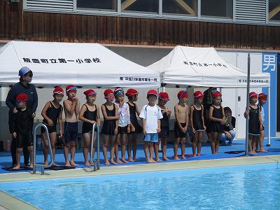 好天の中、水泳発表会を行いました。一人一人が自分の目標を立て、それに向けて授業での練習を頑張りました。1・5・6年生ブロックと2・3・4年ブロックに分けて行いました。一人一人全員ががんばった発表会でした。新記録も2つでました。一つは30年ぶり、もう一つも20年ぶりほど破られなかった記録です。背泳ぎやバタフライでの挑戦もありました。1・2年生は補助プールで主に水泳の頑張りをみせました。50Mでも、みんな素晴らしい泳ぎを見せました。新記録は2名 今までの記録を20〜30秒以上縮めました。飛び込みのない時代で、飛び込みありの記録を破るだけでもすごいことなのに・・・。 引き渡し午後は大雨を想定した引き渡し訓練を行いました。保護者の皆様には一日学校の行事等にご協力いただきありがとうございました。玄関で受け付け 保護者の皆さんには車は駐車場に止めてきていただきます。班ごとにホールで待機。いらしていただいた順番に名簿にチェックし、引き渡しを行います。引き渡し訓練も無事に効率よくお子さんをお渡しできたのではないでしょうか。