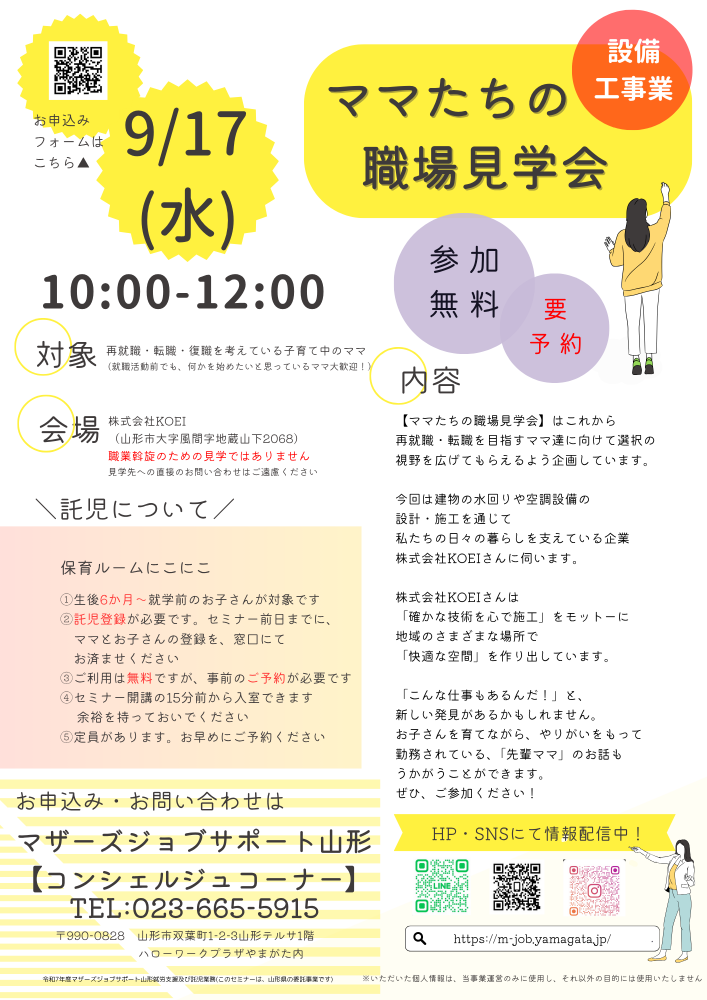 令和7年度1回目の「ママたちの職場見学会」を開催します! この見学会はこれから再就職・転職を目指すママたちに向けて選択の視野を広げてもらえるよう企画しています。 :*:☆:*:◇:*:☆:*:◇:*:☆:*:◇:*:☆:*:◇ 世の中には、いろんな職場があっていろんな仕事があって、いろんな場面でママたちが頑張っています! 日頃、目にすることができない職種のお仕事をその目でご覧になってお仕事探しの参考にしませんか? 第1回目は「 設備工事業 」です!私たちの日々の暮らしを支えている建物の水回りや空調設備の設計・施工などをしているお仕事です☆ぜひ一緒に、見学に行ってみましょう!子育てしながら勤務されている「先輩ママ」の経験談も聴けますよ! -------------------------------------【日時】9月17日(水)10:00〜12:00※移動はタクシーに便乗いただきます【会場】株式会社KOEI【託児】あり【参加料・託児料】無料-------------------------------------□お問い合わせ□マザーズジョブサポート山形【コンシェルジュコーナー】◇電話でのお申込み→023-665-5915◇お申込みメール→コチラ◇LINEでのお申込み→トーク画面にて・お名前・お申込み講座・託児の有無・お電話番号を送信してください。返信をもって申込完了となります。↓公式LINE追加はこちら↓☆メール・LINE・電話での対応は 開庁日のみとなります。 メール、LINEは開庁時間内で 返信いたします。
