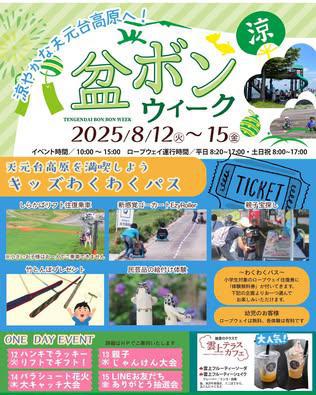 恒例企画「盆ボンウィーク」を今年も開催します!厳しい暑さが予想されるお盆に天元台高原で涼やかに過ごしませんか?◇イベント日時 2025年8月12日(火曜日)〜8月15日(金曜日) 10:00〜15:00ロープウェイ運行時間 平日8:20〜17:00 土日祝8:00〜17:00◇イベント内容「キッズわくわくパス」(体験無料券)小学生ロープウェイ往復券に付属します下記体験よりひとつ選んで楽しめます・しらかばリフト往復乗車・新感覚ゴーカートEzyRoller・親子宝探し・竹とんぼプレゼント・民芸品絵付け体験※幼児のお子様はロープウェイ無料・体験有料です◆ONE DAY EVENT日替わりで楽しい企画を開催!8/12(火)ハンキでラッキーリフトでギフト!8/13(水)親子じゃんけん大会8/14(木)パラシュート花火大キャッチ大会8/15(金)LINEおともだちありがとう抽選会詳細はこちらをご覧ください。【お問い合わせ】天元台高原 TEL:0238-55-2236