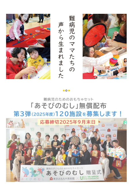 医療的ケア児等コーディネーター支援協会事務局よりご連絡がありました。東京おもちゃ美術館さんより、難病児向けおもちゃセット「あそびのむし」無償配布のご案内があったそうです。 2025年度 新規配布先120施設を募集中で、ご応募が必要です。世界のおもちゃ40点がおもちゃBOX2箱で届きますが、法人の主催するセミナーやオンライン研修に参加(2回必須)、報告書(2回)、アンケートへの回答など6項目の「応募条件」があるようです。応募フォームを十分に確認の上、ご検討してみてはいかがでしょうか。普段お子さんがいらっしゃらない施設でも、交流や訪問などでおもちゃを活用できる場合は、ご応募の対象になるそうです。★★★★★★以下、ご連絡の内容です★★★★★★【全国120施設募集】おもちゃセット「あそびのむし」無償配布について 東京おもちゃ美術館の石井と申します。医療的ケア児や重度心身障害児も遊びやすく、スタッフさんも使いやすいおもちゃセットを、全国の施設に無料でお届けします(日本財団助成事業)。●2025年度 新規配布先120施設を募集中!● 応募締切:9/30(火)●応募フォームはこちら https://business.form-mailer.jp/lp/b177d779296495研修会や交流セミナー、2026年5月の全国大会も開催予定この機会に、全国の仲間と“遊び”の輪に参加しませんか?詳細はこちらhttps://asobinomushi.net/