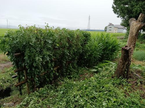 春に新芽を摘んで楽しんでからは、しばらく新梢を摘んで天ぷら、うこぎごはん、味噌和え、おひたし、はたまた一夜漬けなどで食します・・7月頃までは新梢摘んでいればそう伸びないウコ、しかしそこも終わると、気が付けば一気に伸びてしまい・・枝も固くなりとげも固くなる・・・・新梢摘みも終わり気がついたら伸びホーダイとなり、ようやく剪定しました・・年2回ほどやんないといかんですね・・また来年の新芽と新梢の為・・刈るときはゴム手2重で行ってます。