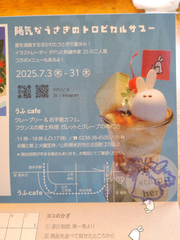 赤湯出身のイラストレーター、タドリさんと刺繍作家25さんの二人展が、【うふカフェ】(米沢市古志田町2782-2)にて開催中!7/3-7/31までの開催予定でしたが、8/18(月)まで延長して開催中とのことです(個展コラボメニューもあり☆)↓↓ちょうど作家のお二人のご来店時に遭遇しました(〃'▽'〃)感激☆思いがけず、アートに触れた休日となりました(*^-^*)嬉※ ご本人、お店の了承を得て撮影、掲載しております。〈タドリさんXより〉--------------------------------------------------------二人展『陽気なうさぎのトロピカルサマー』が延長中!7/3(木)〜8/18(月)うふカフェ(山形県米沢市古志田町2782-2)11時〜18時(L.O.17時)定休日:水曜と第2火曜-------------------------------------------------------------------------------------------