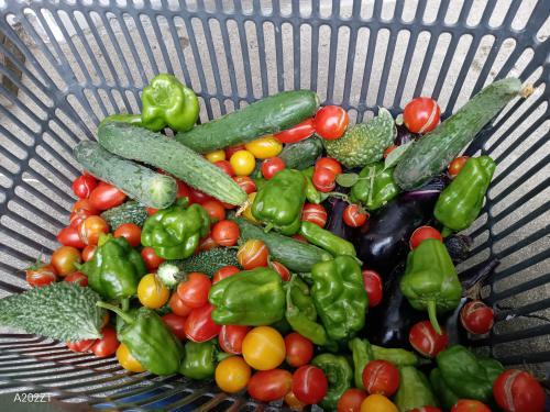 暑い日が続いていますね、一昨日から4連休して、最初の2日間は海にキャンプ予定も都合で来週になりまして・・それではと・・菜園の草刈り・草むしり・序口の除草・トマトや、ナス、キュウリの剪定、ブドウの網掛けなどやることたくさんあれど、日中は暑すぎてやる気が起きず、甲子園観戦とギター練習・・昼風呂からの昼寝・・そして定番の水戸黄門をみてビールを食らう・・そんであっという間に一日が終わる・・だらけた生活になりつつ・日中は暑くて外にはいられない、朝の涼しいうちに朝採り野菜です・・キュウリにミニトマト、ナス、シシトウ、ピーマン、ゴーヤーです。